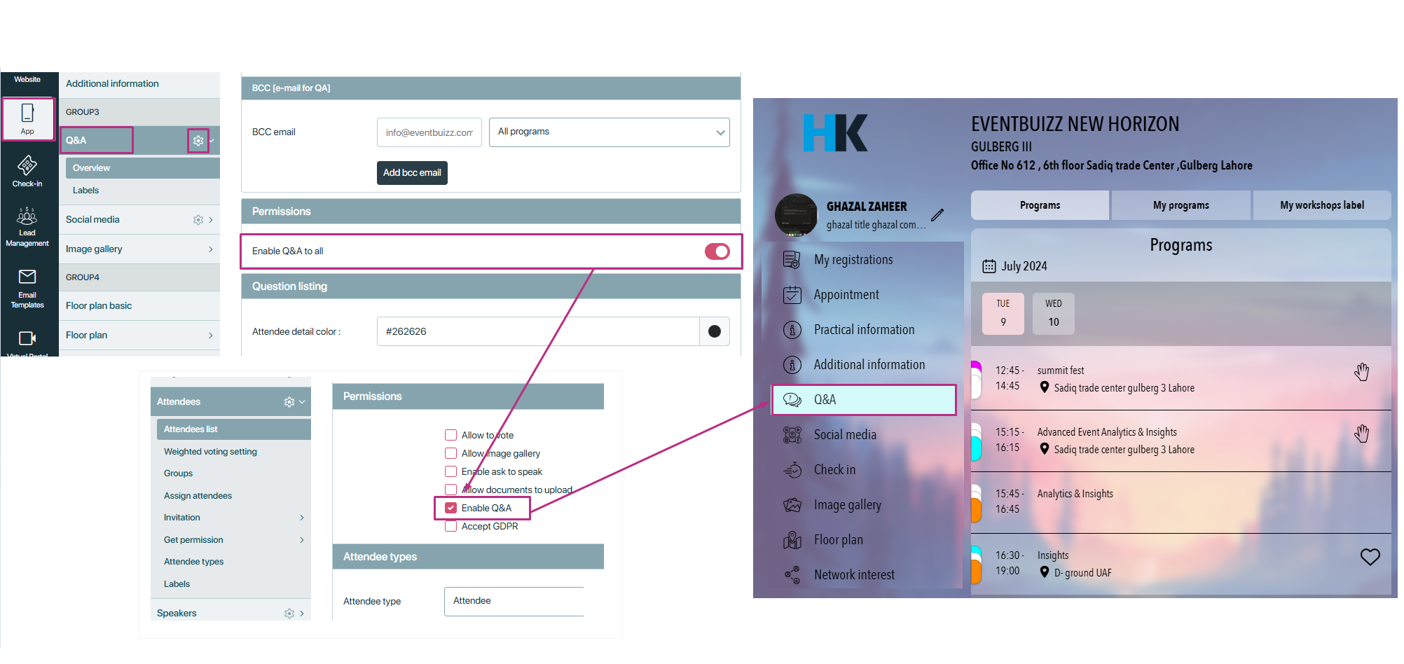 - Enable Q&A: We have “Enable Q&A to all” permission in Q&A module, it will allow all attendees to ask questions but if this setting is OFF, and in attendee profile individual setting is ON, it will not check the Q&A module permission and allow the attendee to ask question.