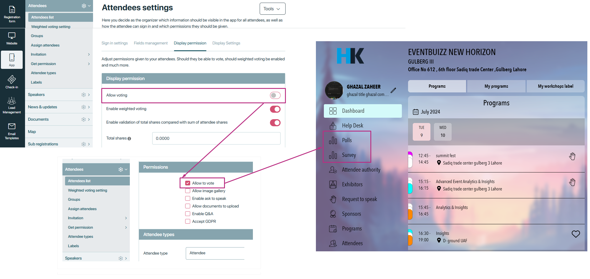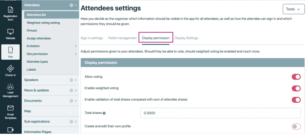 - Allow to vote: In the attendee settings -> display permissions, there is also an option for “allow voting. If this setting is turned on, all assigned attendees in the event can vote. However, if this setting is turned off and individual attendees have enabled this setting in their profiles, they will bypass the main setting and still have permission to vote.