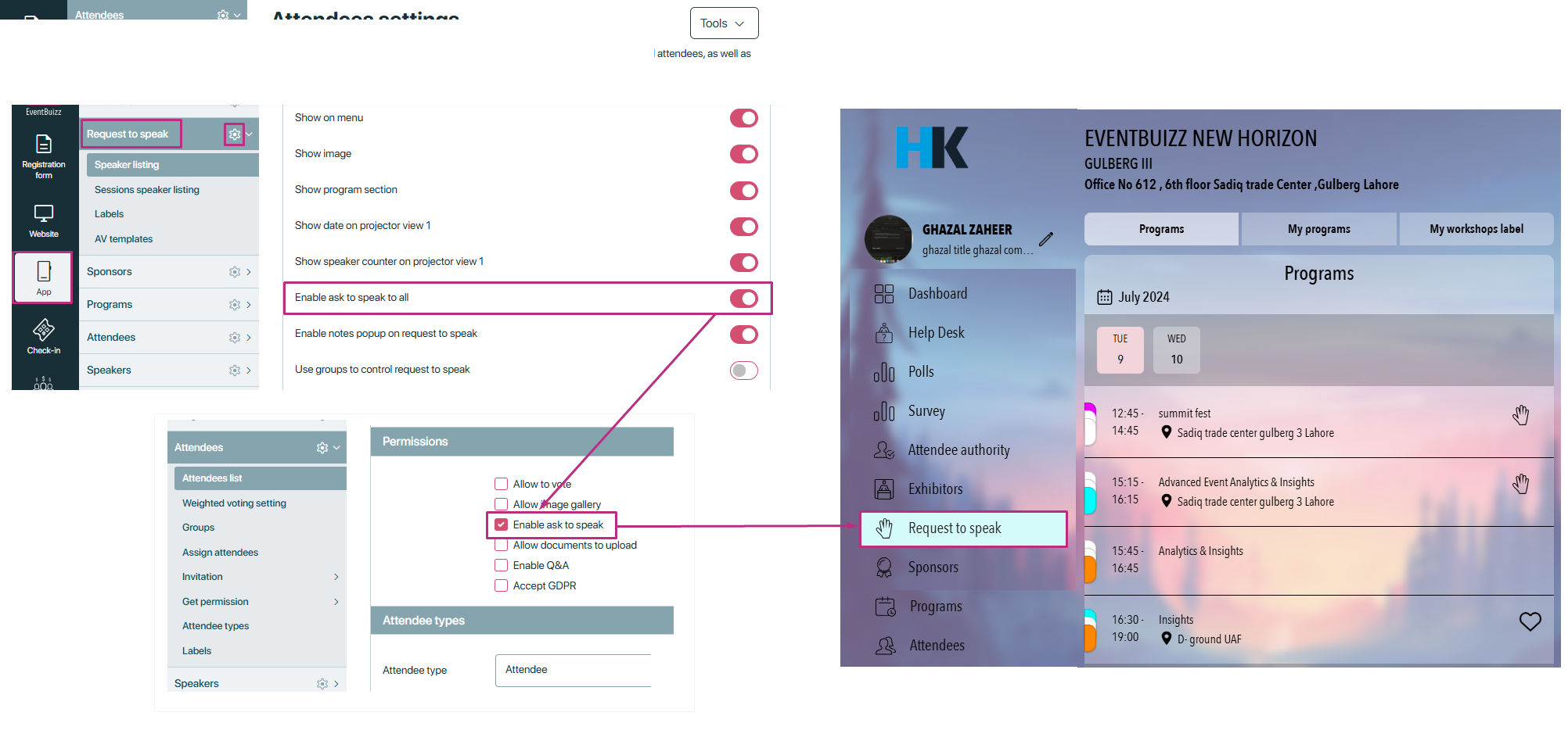- Enable ask to speak: We have “Enable ask to speak to all” permission in request to speak module, it will allow all attendees to speak who are assigned in the event but if this setting is OFF, and in attendee profile individual setting is ON, it will not check the module permission and allow the attendee to speak.