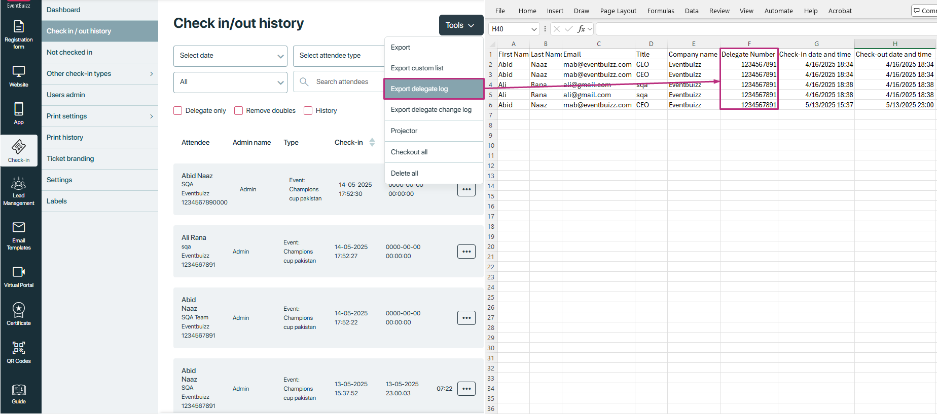 The Export delegate log feature is specifically designed to generate a file that includes only those attendees who have been assigned a delegate number in their profiles. This export option is ideal for organisers who need to track or report on official delegates separately from general attendees. When this function is used, the system filters the check-in/out history and compiles a file—typically in CSV or Excel format—that contains relevant details of delegate participants only, such as their name, delegate number, check-in and check-out times, and other associated information.