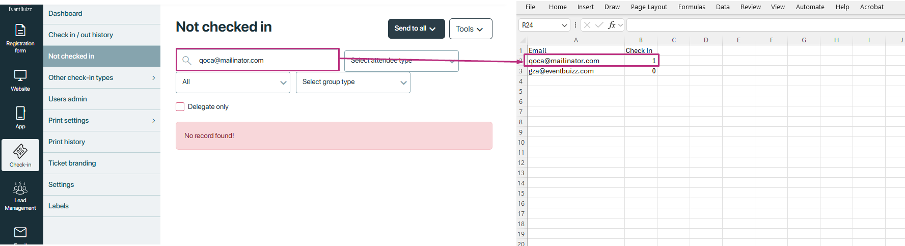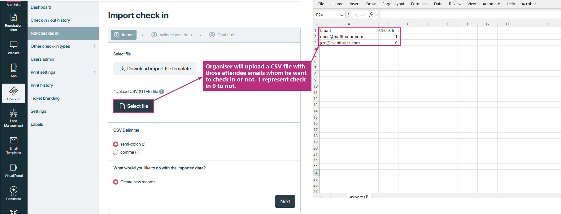 - Functionality: Allows the organizer to export a CSV file containing logs of all attendees whose check-in and badge printing processes have been completed.