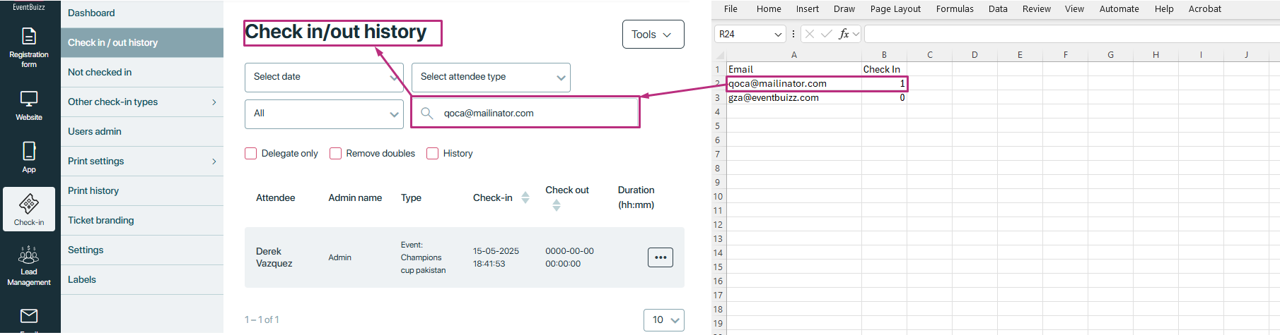 The History checkbox filter provides organisers with the option to include deleted records from past check-in/out activities in the listing, offering a more comprehensive and transparent view of each attendee’s full history. When this filter is enabled, entries that were previously removed—whether due to error corrections, duplicates, or manual deletions—are restored for viewing purposes. This feature is especially valuable for audit trails, internal reviews, or post-event analysis, as it ensures that no data is permanently hidden and all actions taken on attendee records can be tracked. By giving organisers access to the complete historical log, including both active and deleted entries, the History filter enhances accountability, supports accurate reporting, and strengthens event data integrity.