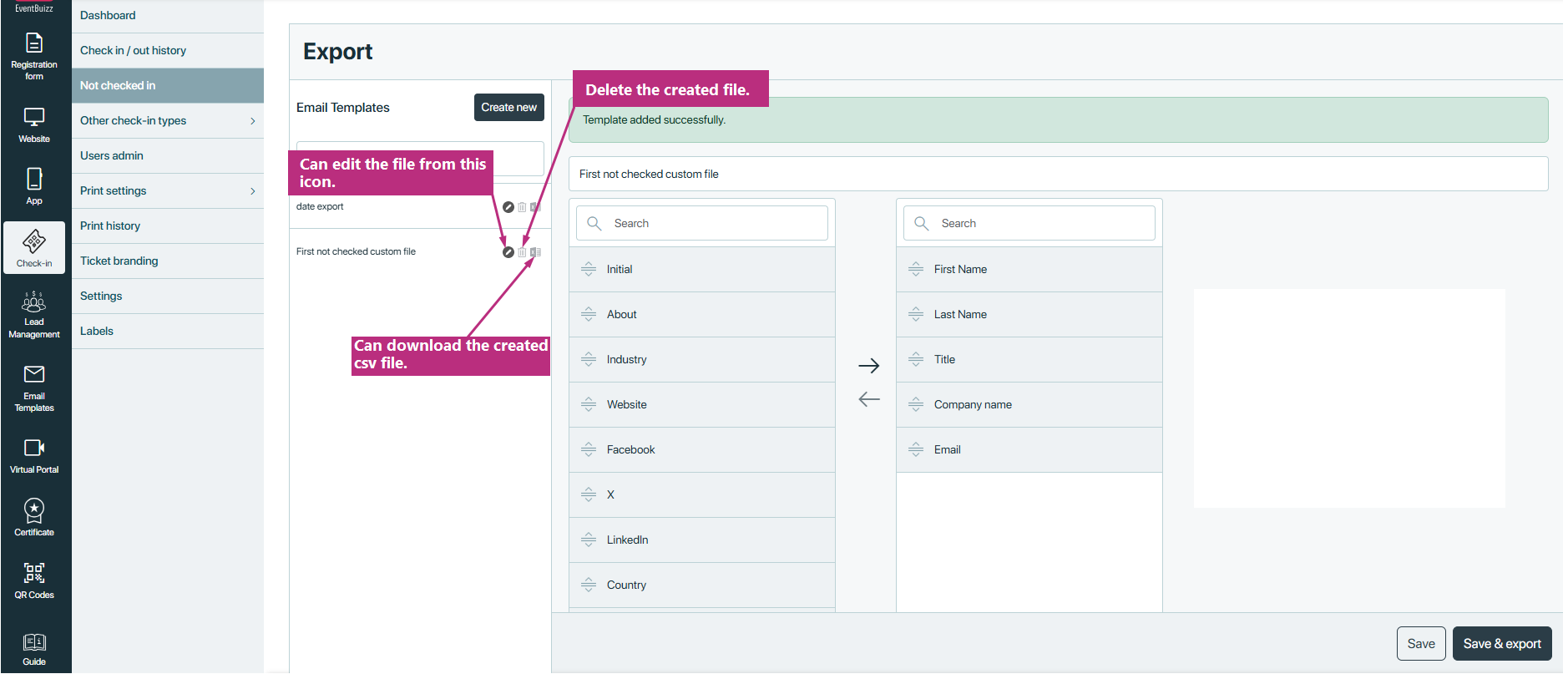 Additionally, once a custom export template is created and saved, it is stored under the Email Templates section for future use. From there, organisers can edit, delete, or download any previously created templates, making it easy to manage and reuse export configurations for different events or reporting purposes. This feature not only streamlines the data export process but also enhances efficiency by reducing the need to reconfigure export settings each time.