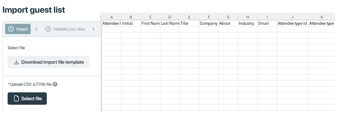 A CSV file, is an excel file saved in a comma separated version. Insert your list of guest in a CSV file. As a minimum, you must fill out the columns First name and Email. Then select file and upload the file and click next.