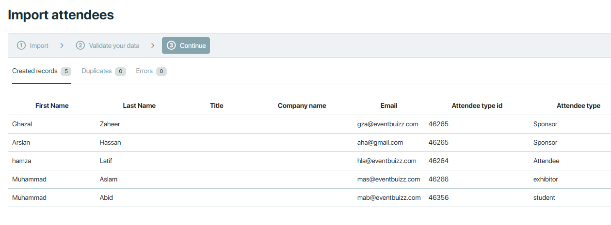 The system will inform you about invalid email addresses – click on errors to see which if any. Please correct, import and go through the same process again. You can re-use the CSV file to import again. The system will list emails of duplicates who received the invitation before – and not send the invitation again.