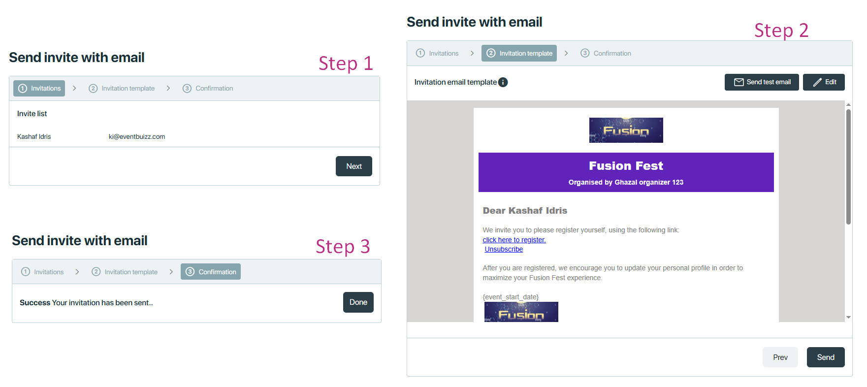 A fixed list of attendees can be invited to register in the Event center. The key to register is the link to the registration site – the URL that appears when clicking Reg. Site Preview. This can be distributed in different ways. When uploading your guest list in the Event center, you will keep track of attendees not registered and declined the invitation to register.