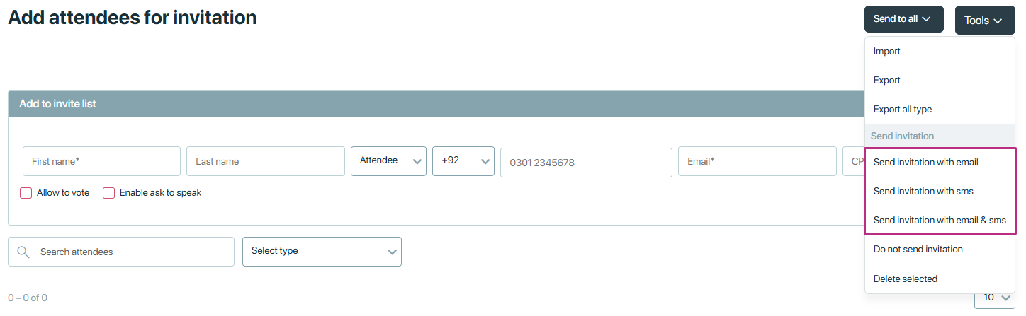 The “Delete Selected” option allows users to remove one or more selected attendee from a invite list.