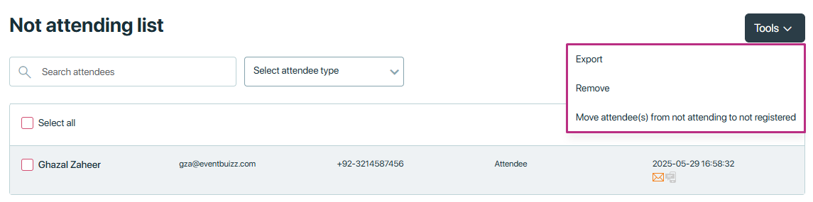 - Move attendee(s) from not attending to not registered: It moves selected attendees from the “Not Attending” list back to “Not Registered” — giving them another chance to register. This is useful when:
