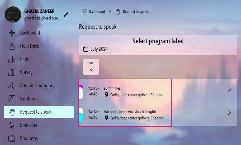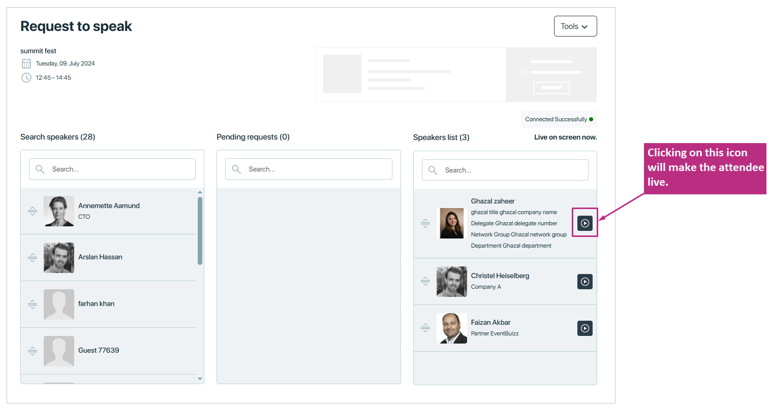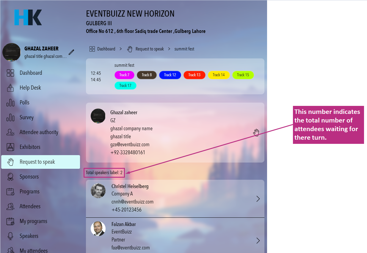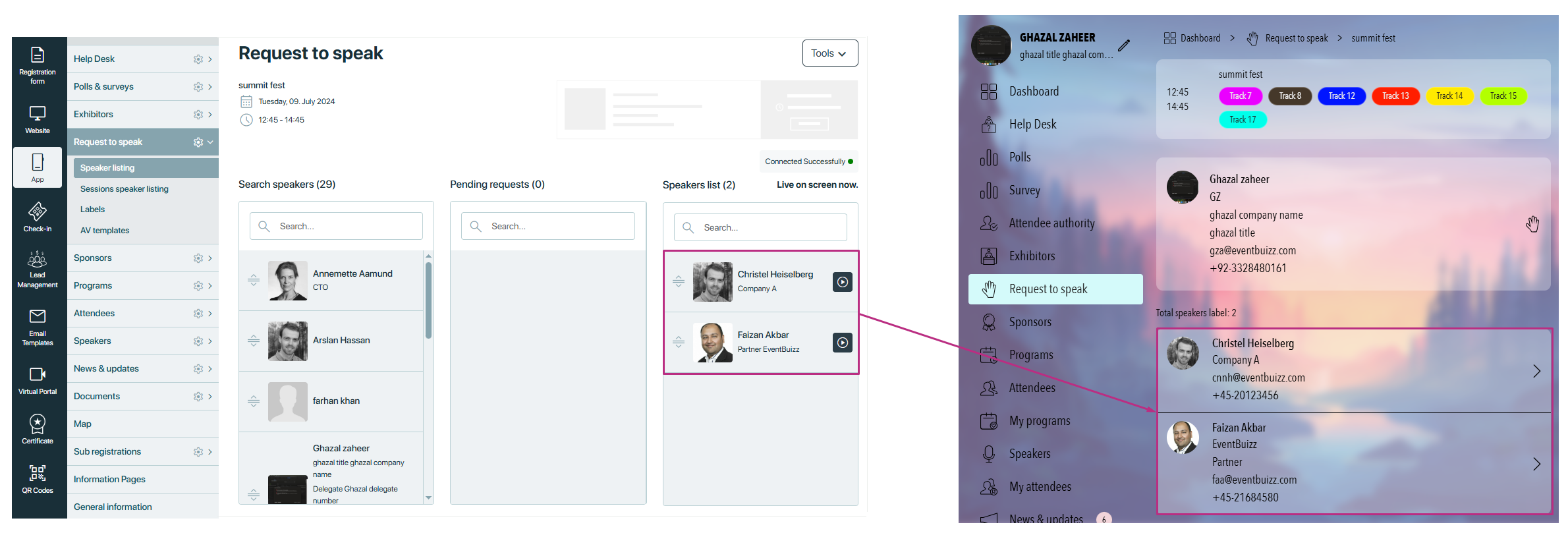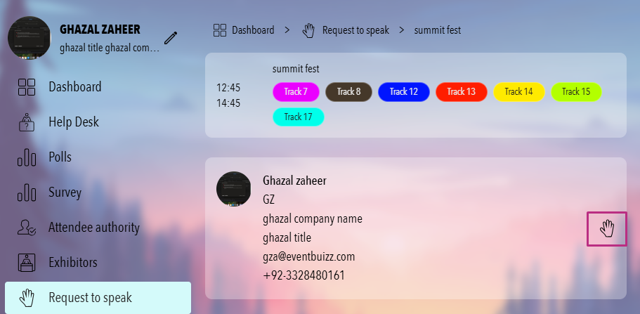 In Eventbuizz, “request to speak” refers to a feature that allows event attendees to signal their desire to speak or ask a question during an event, such as a conference or webinar.