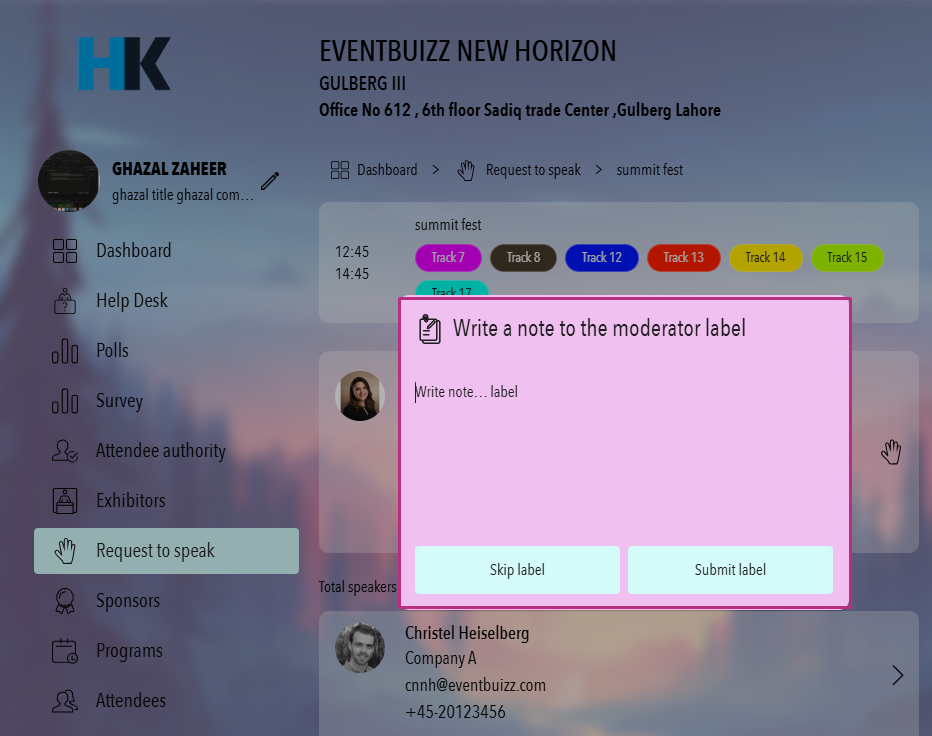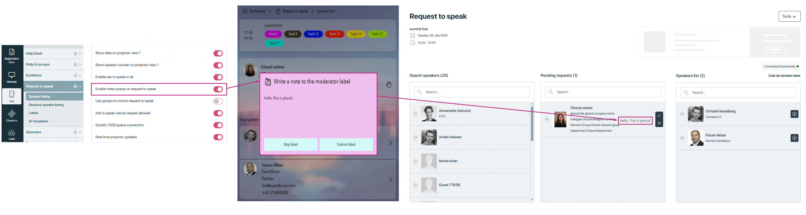 If the “Enable notes popup on request to speak” is  ON, then the popup will appear, allowing the user to write a note. These notes will be shown to the organizer in the event center.