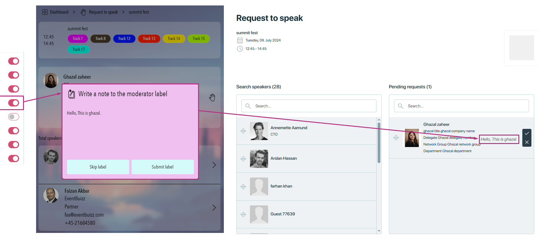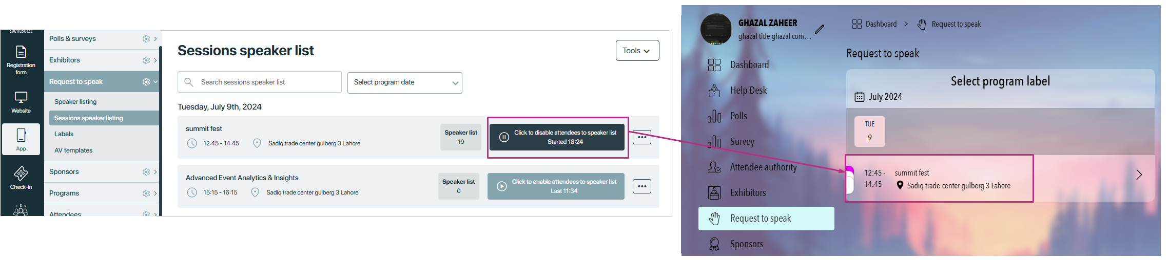 However, there are also individual settings for each attendee. If “Enable ask to speak to all” is OFF but an attendee’s individual setting is ON, then only that attendee will see the request to speak module. All other attendees (whose individual setting is OFF) will not see the module.